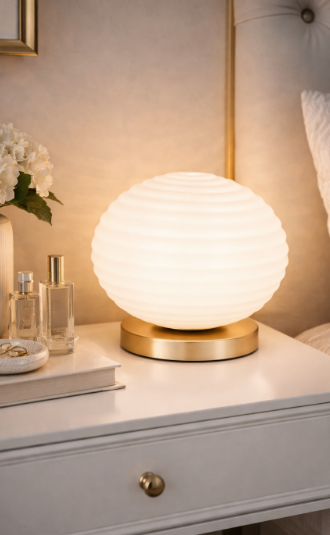Stolní lampa RIPPLE od značky FAN Europe spojuje jemně vroubkované opálové sklo se sofistikovanou matně zlatou základnou. Kulovitý tvar o průměru Ø 32 cm působí harmonicky a zároveň výrazně – stane se nepřehlédnutelným doplňkem každého moderního interiéru. Světlo prochází přes strukturované sklo měkce a rovnoměrně, čímž vytváří příjemnou atmosféru pro večerní relax i reprezentativní chvíle.