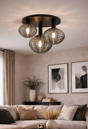 Stropní svítidlo RIPPLE od značky FAN Europe přináší výrazný design v kompaktním provedení. Tři skleněná stínidla s charakteristickou vlnkovou strukturou vytvářejí působivý světelný efekt a dodávají interiéru hloubku i dynamiku. Kouřové sklo v kombinaci s černou kovovou základnou působí moderně, lehce industriálně a zároveň elegantně. Díky stropnímu uchycení je ideální volbou do prostor s nižším stropem, kde chcete zachovat vzdušnost a současně získat dostatek světla.