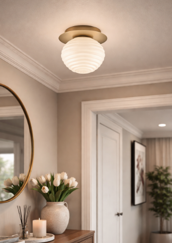 Stropní svítidlo RIPPLE od značky FAN Europe spojuje jednoduchý tvar s dekorativním detailem. Opálové skleněné stínidlo s charakteristickou vlnkovou strukturou vytváří příjemné, měkké světlo bez oslnění a zároveň působí elegantně i při zhasnutém stavu. Zlatá kovová základna dodává svítidlu hřejivý a luxusní akcent, který se snadno kombinuje s interiéry laděnými do béžových, krémových či přírodních tónů. Díky průměru Ø 20 cm je ideální jako hlavní světlo do menší místnosti nebo jako doplňkové osvětlení v kombinaci s dalšími svítidly z kolekce RIPPLE.