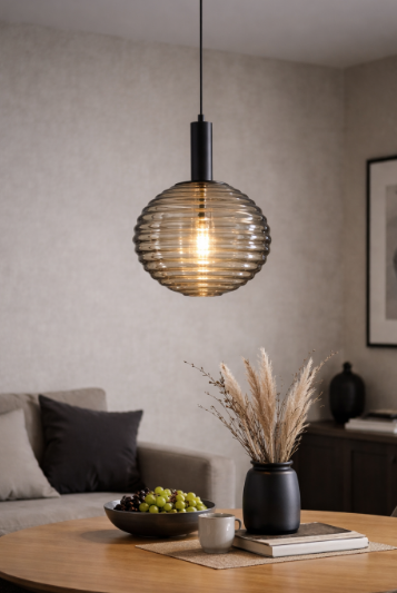 Závěsné svítidlo RIPPLE od značky FAN Europe zaujme na první pohled svým charakteristickým sklem s plastickou „vlnkovou“ strukturou. Kouřové transparentní stínidlo vytváří jemnou hru světla a stínu a dodává prostoru hloubku i styl. Černá kovová konstrukce podtrhuje moderní charakter svítidla a dělá z něj univerzální doplněk do současných interiérů. Díky průměru 32 cm je ideální jako solitér nad jídelní stůl, konferenční stolek nebo jako výrazný prvek v menší místnosti.