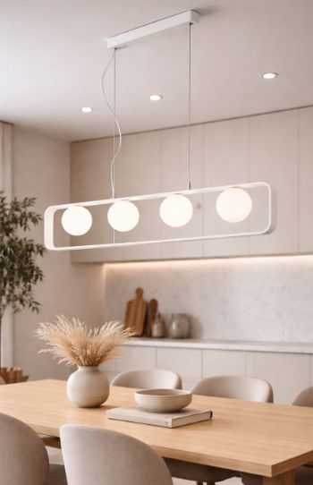 Čtyři opálové skleněné koule s paticí G9 zajišťují rovnoměrné rozptýlení světla a vytvářejí příjemnou atmosféru bez oslnění. Díky délce 100 cm je svítidlo ideální nad delší jídelní stůl, pracovní desku nebo kuchyňský ostrůvek, kde poskytne dostatek světla i vizuálního efektu.