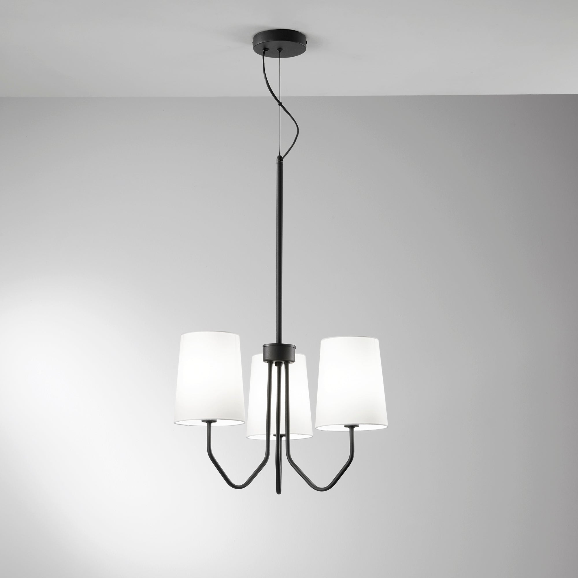 Přidejte do svého interiéru sofistikovanost a moderní šarm se závěsným svítidlem SALLY v černé barvě od renomované italské značky FAN EUROPE. Tento elegantní kousek s kovovým černým rámem a třemi bílými látkovými stínidly se stane výrazným prvkem každé místnosti, přitom zůstává nenápadně vkusný a jemný.