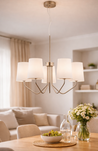 Závěsné svítidlo FAN Europe SALLY 5xE14 v elegantním niklovém provedení zaujme svým vzdušným a moderním designem. Jemně tvarovaná kovová konstrukce v kombinaci s decentními textilními stínidly vytváří harmonický celek, který dodá interiéru lehkost a styl. Svítidlo poskytuje příjemné, rozptýlené světlo, ideální pro každodenní použití i večerní atmosféru.