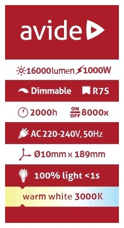 Lineární halogenová žárovka 1000W s délkou 189mm, s paticí R7s, určená pro reflektory, vyzařuje příjemné světlo a potěší skvělým poměrem cena/výkon.