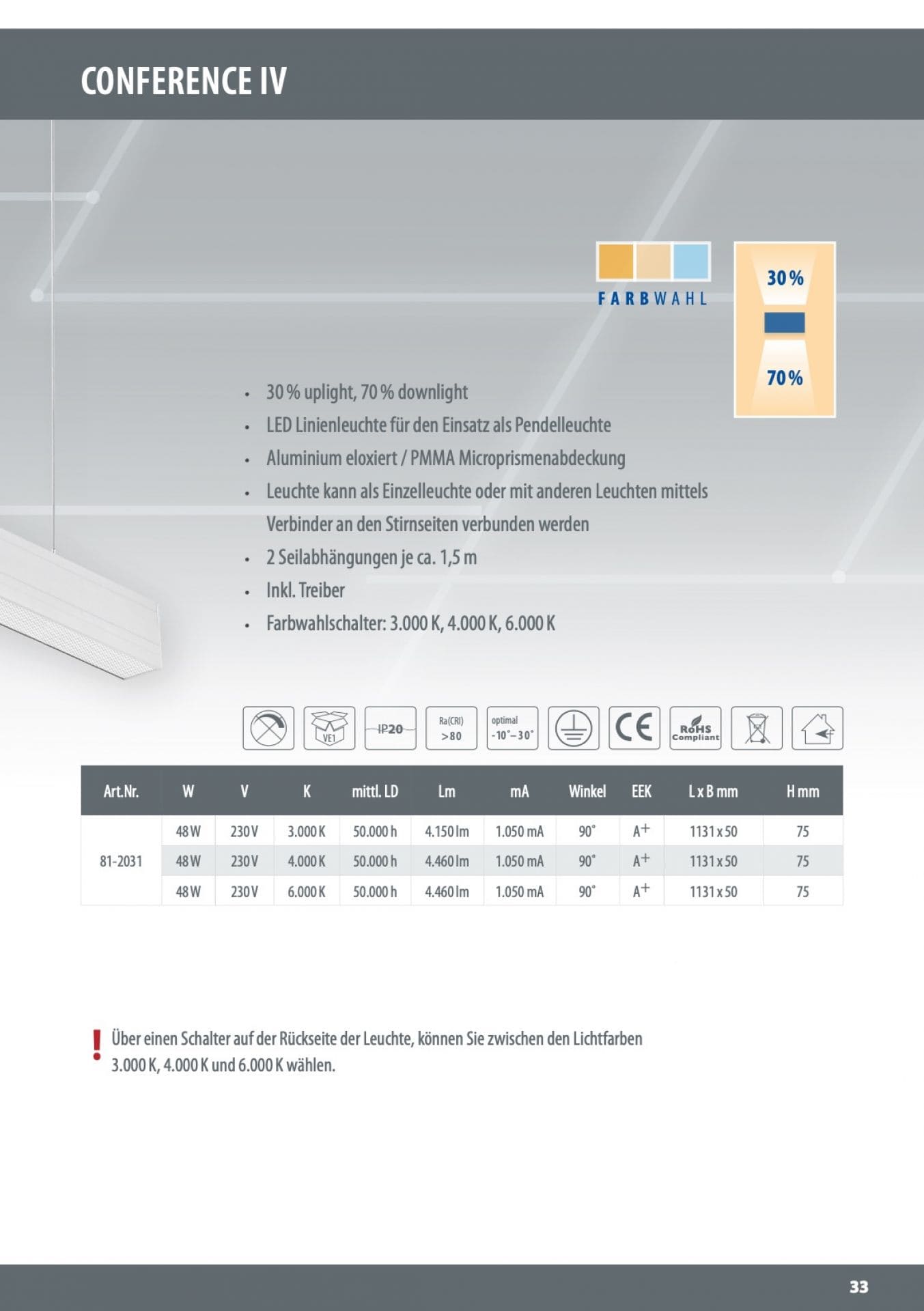 Závěsné LED svítidlo, které lze propojovat do linie s použitím rovné spojky (89-1021) nebo pomocí otočného kloubu (89-1022) + boční spojky (89-1023), není součástí balení. Lze nastavit barvu osvětlení 3000/4000/6000K. Svit je rozdělen na 70% dolů + 30% nahoru (zabrání tmavému stropu). Má prismatický diruzor, který neoslňuje - příjemný výstup světla.
