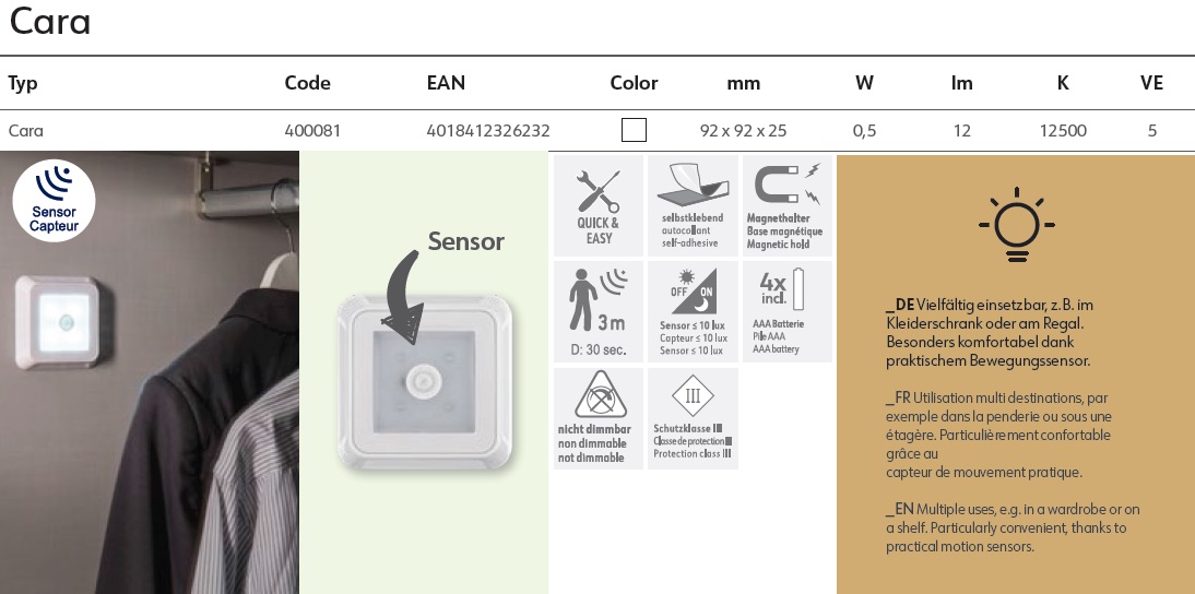 Nezáleží na tom, zda jde o orientační světlo nebo dekorativní osvětlení: mobilní, bezdrátové LED bateriové světlo Cara Sensor lze použít různými způsoby a zajišťuje bezpečnost například na chodbách. Zvláštní přednost: Bateriové světlo má pohybový i soumrakový senzor. Ty jsou trvale aktivovány a rozsvítí světlo, když za soumraku zaregistrují pohyb. Uchycení je snadné pomocní magnetického štítku.Součástí balení jsou také 4x AAA baterie.