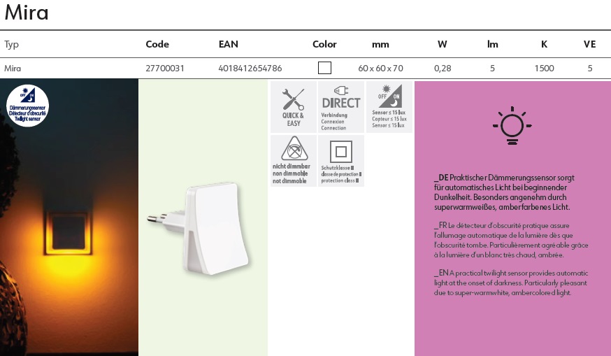 Mobilní LED noční světlo s praktickým soumrakovým senzorem. Automatické světlo ve tmě. Rychlá a snadná instalace: Přímo připojen do zásuvky. Super teplé bílé světlo (1500k) pro příjemnou atmosféru, ideální do ložnice a dětského pokoje, chodeb.